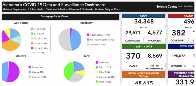 According to the Alabama COVID-19 Data and Surveillance Dashboard, about 43% percent of COVID-19 cases in Madison County have been Black people. This may not seem like an overwhelming rate, but we also know that black people only make up 24% percent of the population in that county.